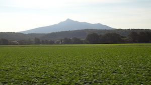 進行方向右側には、先端の尖った斜里岳が並走しています。そして右側前方には、頂の丸い羅臼岳も見えています。