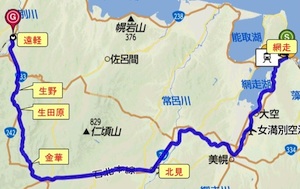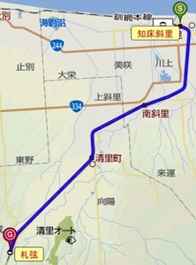知床斜里で3分停車し、網走駅を目指します。地図でわかるように、ここからはオホーツク海に沿って走ります。列車の右側の車窓にはオホーツク海が広がります。