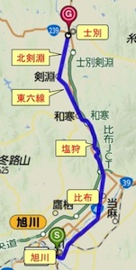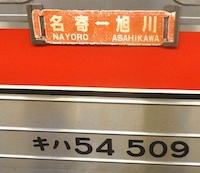 行き先表示板は「名寄←→旭川」となっていますが、実際は稚内行きです。「稚内←→旭川」という表示がなかったのでしょうか。車内は明らかな鉄っちゃん2人と地元のお客さん2人でしたが、発車が近づくにつれて増えて来ました。結局、若い鉄っちゃんの団体も乗車し、20人以上のお客さんを乗せて旭川駅を出発しました。あの年配の人ととも再々遭遇しました。根室で宿泊したあと、昨日は釧路から特急列車を使って札幌経由で旭川まで来たようです。プランはどのようにして立てているのかなどなど、いろいろと質問を受けましたので、できるだけわかりやすくお答えしました。