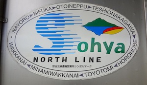 その次は咲来駅です。そしてその次は音威子府駅に到着しました。ここで28分間停車します。車両側面には写真のような「宗谷北線運輸営業所シンボルマーク」がありました。
