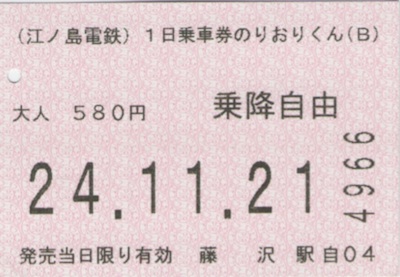 江ノ電の一日フリーきっぷの「のりおりくん」は駅の券売機で買うことができます。料金は580円です。ちなみに藤沢ー鎌倉間は290円ですので往復するのと同じ金額です。