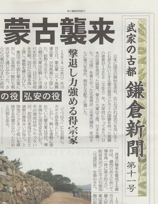 「鎌倉新聞」なる新聞も構内にありました。手にとってみると、1面トップの記事は「蒙古襲来」でした。よくみると「この企画は毎月1回、本格的な武家政権である鎌倉幕府の誕生から滅亡に至る出来事を記事形式で紹介します。」と書いてあります。記事には「蒙古皇帝フビライの国書を持った高麗の使者が1268(文永5)年、太宰府にやってきた。日本が返書を見送った結果、蒙古の大軍は2度、日本を襲った。「元寇」を乗り切った北条得宗(北条氏嫡流)家はさらに権力を強め、朝廷も支配下に置いた。」と詳しく書いてあります。地図までついています。