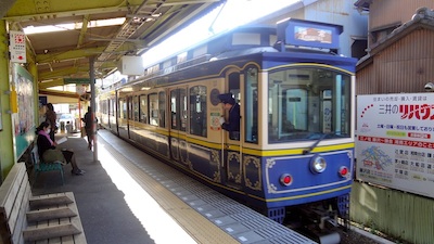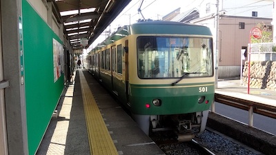 最後尾に乗り込みました。ビルの2階から江ノ電の旅のスタートです。