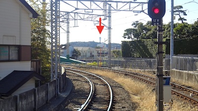 ホームの海側からは遠く江ノ島(矢印はシーキャンドル)が見えます。
