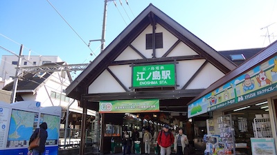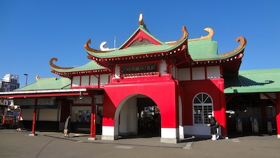 小田急江ノ島線の終着駅である片瀬江ノ島駅の前を通ります。竜宮城の形をしているユニークな駅です。