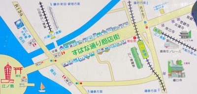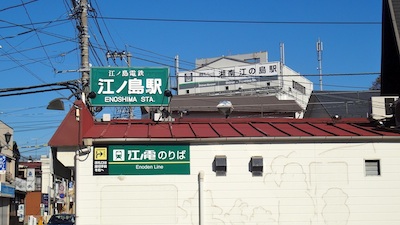 すばな通り商店街を北上すると江ノ電江ノ島駅が見えてきますが、その向こう側には湘南モノレールの湘南江の島駅の看板が見えています。