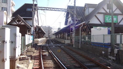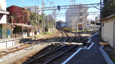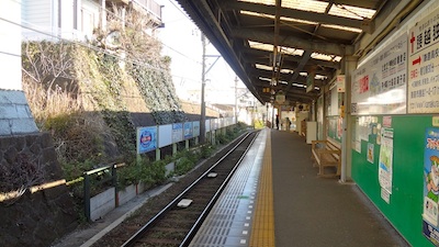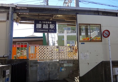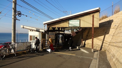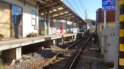 路面区間が終わると腰越駅です。この駅はホームが短いので鎌倉よりの1両はホームからはみ出てしまいドアがあきません。藤沢側は道路なので延長できず、鎌倉側は民家のためかホームを延長できないようです。