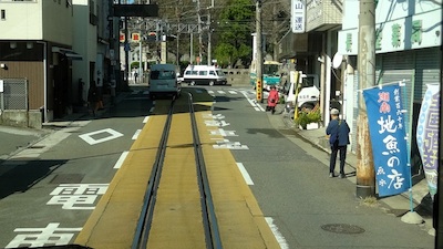 さて藤沢方面からやってきた電車に乗り込みます。ここで待ち合わせです。しばらくして鎌倉方面からの電車が来ました。これから隣の腰越駅に向かいます。江ノ島駅から腰越駅の間は路面区間です。