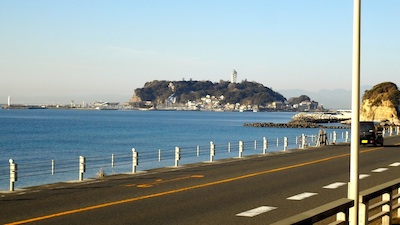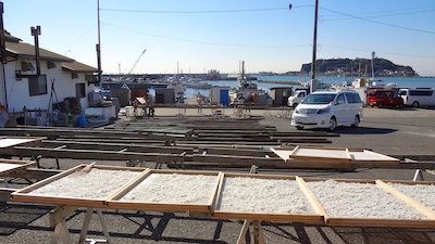 海岸からの江ノ島はまるで絵はがきのように綺麗です。そして漁港ではとれたばかりのしらすを干しています。