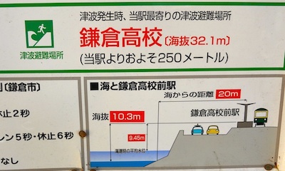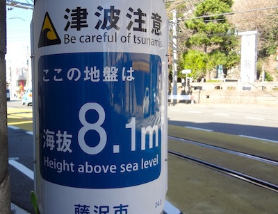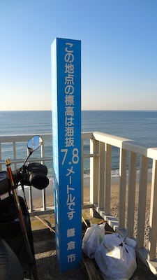 江ノ島駅に戻るように歩いていると、写真のような「ここの地盤は海抜8.1m」という津波注意の標識があります。2011/3/11の東日本大震災の教訓なのでしょう。