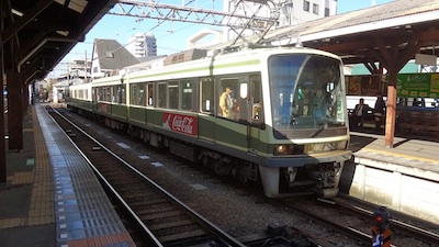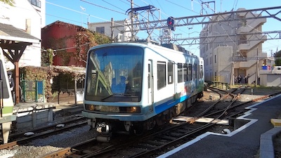 龍口寺の前に電車がやってきました。鎌倉方面から江ノ島駅に到着する電車です。
