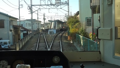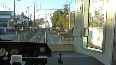 鵠沼駅に到着しました。ここで列車交換です。小さな男の子と若いお母さんが最前列を目指して乗ってきました。前方展望のできる特等席をさりげなく譲りました。鉄ちゃんイメージアップ大作戦の一環です(笑)。