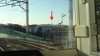 鵠沼駅を出発(矢印は江ノ島のシーキャンドル)