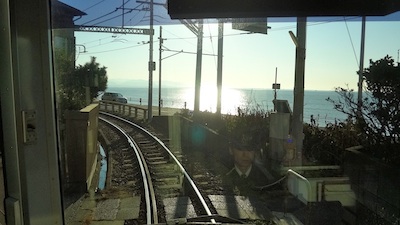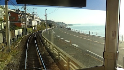 腰越駅を出てからしばらくすると、突然視界がひらけ、湘南海岸沿いへ出ます。もうすぐ、鎌倉高校前駅に到着します。