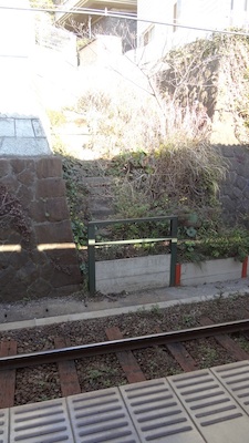 七里ヶ浜駅に戻ります。先ほどは気づきませんでしたが、ホームから線路の向こう側に謎の階段があります。昔は踏切がありその向こうに階段があったのでしょうか?