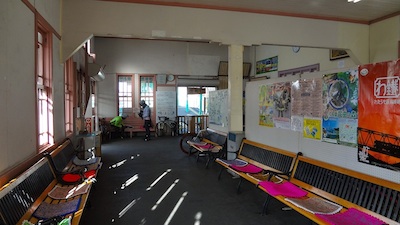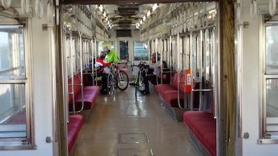 5-6人のロードレース用自転車ライダーが自転車とともに駅舎で待っています。時間帯を選べば、自転車も一緒に乗れるようです。