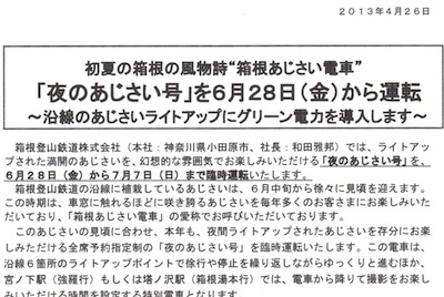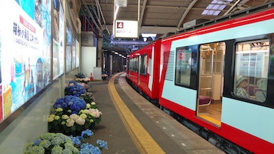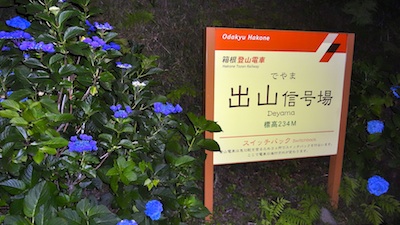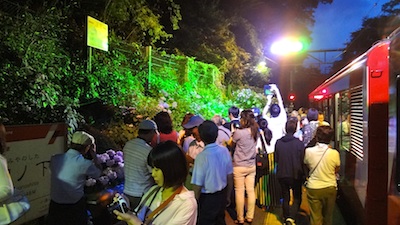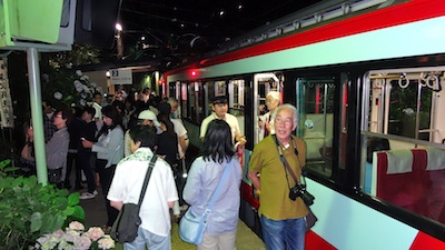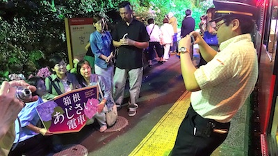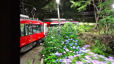宮ノ下駅ではライトアップのあじさいを鑑賞するためにしばらく停車します。