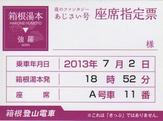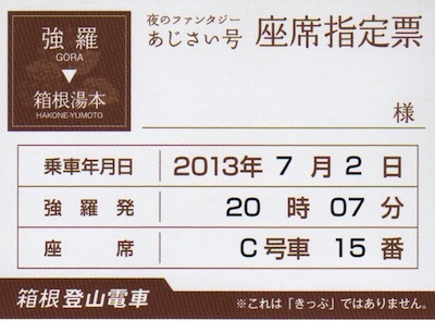 だいぶ時間が経過してしまいましたが、7月2日に箱根登山鉄道の夜のあじさい号に乗ってきました。きっぷ発売日当日と翌日に予約電話をしてみましたが、全く通じません。妻がかけたらあっさりとつながり、切符を取ることができました。予約電話って人をみるのでしょうか(笑)