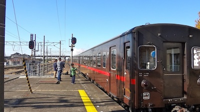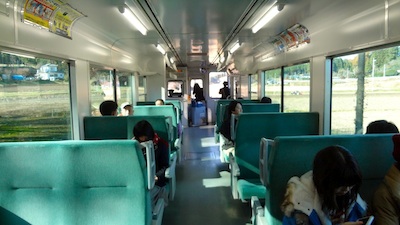 座席に座って弁当を食べていると、お客さんが徐々に増えてきた。家族四人が乗ってきたがロングシート部しか空いていないようだった。弁当を食べ終えた私は、その家族にボックスシートを譲り、ロングシート部へ移ったのであった。鉄ちゃんイメージアップ大作戦の敢行である。そして今日の“ゆずSL”にかけて席を“ゆず”ったのである(笑)。
