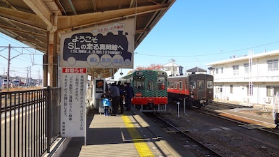 これからSLもおか号に乗って茂木(もてぎ)まで行くのだ。SLの整理券は別途500円が必要だが座席指定はなくすべて自由席だ。出発準備をしている蒸気機関車にはたくさんのカメラが向けられている。もちろん私もそのうちの一人だ。10時18分発の普通列車が出発した後、SLもおか号が入線してきた。