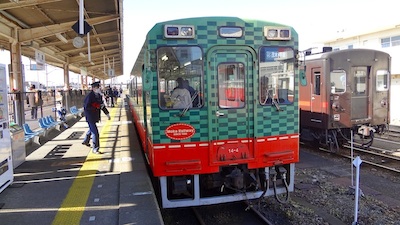 駅に戻り、真岡鐵道ホームに移動する。ホームには普通列車が停車していた。なんだかスイカみたいなデザインだな(笑)。