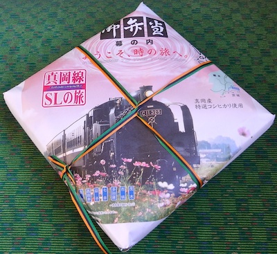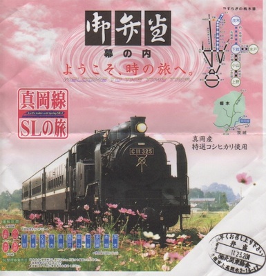 今日は茂木吊産のゆずのキャンペーンが車内で行われることになっており特別に“ゆずSL”として走るようだ。三両編成でセミクロスシートの客車は一両目と二両目に乗客が多く三両目は比較的空いていたので最後部のボックス一つを確保して進行方向窓側に座ることができた。車内販売の準備が整っていたので、発車前だが弁当とカレンダーそしてSLせんべいを購入した。ついに朝食をゲットしたのだ(笑)。