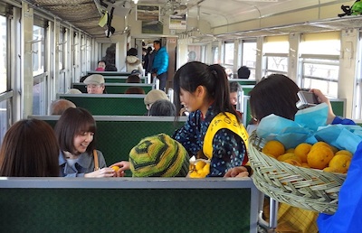 SLはゆっくりと走り、下館を出たあとも、折本、久下田、寺内と次々に停車していく。女子高校生の“ゆず娘”たちが乗客にゆずと特別編集茂木のるるぶを配っている。
