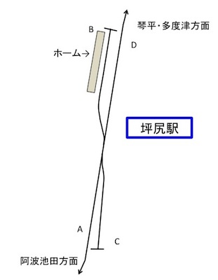 特急はDからAへ向けて駆け抜けていきますが、左側に坪尻駅のホームとBの線路が見えています。