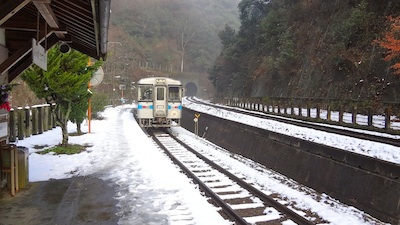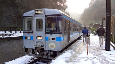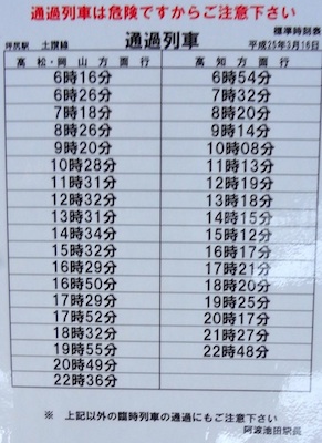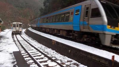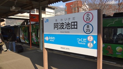 高知駅6時ちょうど発の特急南風2号はまたしてもアンパンマン列車で5両編成でした。高知駅を出発してもまだまだ真っ暗です。昨日通った新改駅も闇の中でした。繁藤駅でやっと薄明るくなってきました。列車は大杉、大歩危に停車して阿波池田に到着しました。ここで下車します。