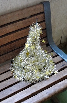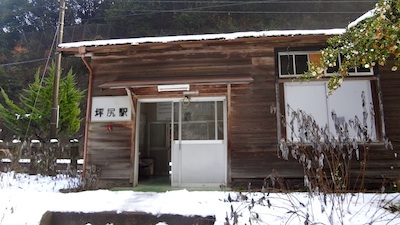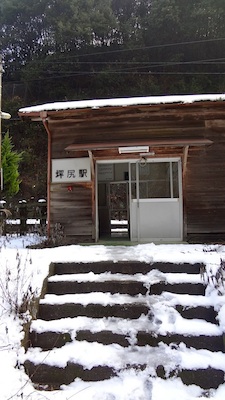 駅舎までの階段にも積雪が多く、とても滑りやすい状況です。駅舎内のベンチには小さなクリスマスツリーが飾られていました。