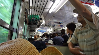 ところが車内は満席です。なんとかロング部の一番後ろの車端部に座りましたが、立ち客もいっぱいで、自由に行き来ができないばかりか、窓を振り向くことさえできません。こんなに混雑しているとは予想だにしていませんでした。