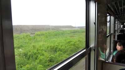 陸中野田駅と野田玉川駅との間では、「このあたりは津波の被害が甚大で復旧にはかなり大変でした。」という主旨の放送が流れました。何とか中腰になり身体を捻って撮ったのがこの写真です。ロングシートに座ってしまったために、かえって身動きがとれません。もっとも立っていたとしても、それほど自由度は高くないのですが。