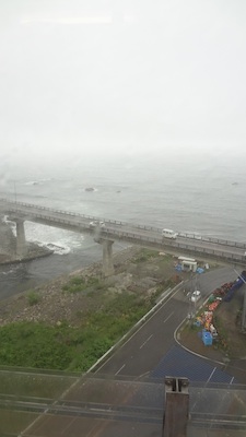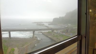 野田玉川駅を出て、次の堀内駅の手前に、安家川橋梁(あっかがわきょうりょう:長さ302m、高さ33m)があります。そこからの景色が素晴らしいというので列車が停車して、車内放送が流れました。しかし、天候が悪化して雨が降り出し、ご覧のようなありさまです。安家川で天候が悪化なんて、しゃれにもなりません。