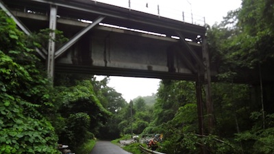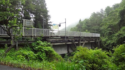次の列車も満員でした。ドアから車内に入るのが精一杯で、海側の車窓はまったく見えません。そして大沢橋梁(長さ176m、高さ30m)でも、車内放送が流れ、景色を見られるように徐行してくれます。しかし、山側のこんな写真しか撮れませんでした。