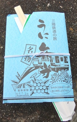 白井海岸駅の愛称は“ウニの香り”です。予約して久慈駅で買ったうに弁当がまだありますので、ここで食べることにしましょう。