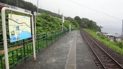 この駅はトンネルに挟まれており、家は見えません。秘境駅のサイトの第14位にランクされている秘境駅です。こんな秘境駅なのに私以外にも列車から降りた人がいました。彼は大阪から来ており、この三連休を利用して北三陸の途中下車の旅を続けているようでした。また、どこかで会いそうな気がします。