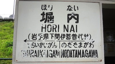 堀内駅の駅名標です。この駅の愛称は“義経の祈り”です。近くにある鵜鳥神社に義経伝説があるからだそうです。