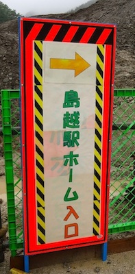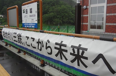 「おかえり三鉄。ここから未来へ。」という垂れ幕がかかっています。ここは東日本大震災で、駅舎・ホームのみならず、線路まで津波で消失してしまいました。