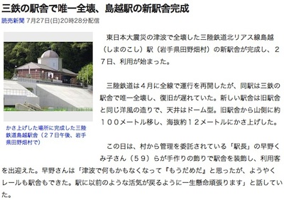 左は田野畑駅に展示してあった震災前の写真で、右は「旅と鉄道」2014年5月号に掲載されていた震災前の駅舎です。島越駅前の海岸はやはり海水浴場だったようです。なぜ海水浴場として復活させずに、漁港になるのでしょうか。理由がわかりません。