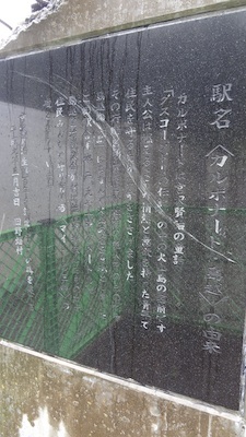 島越駅の駅名標です。この駅の愛称は“カルボナード”です。これは宮沢賢治の童話のカルボナード火山島に由来するそうです。