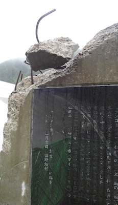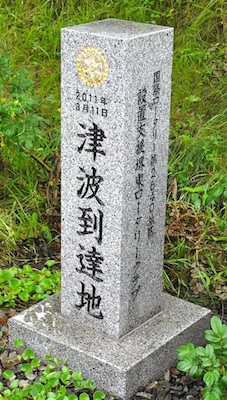駅舎の目の前には津波到達地の石碑がありました。かなり高い場所まで津波が到達したようです。