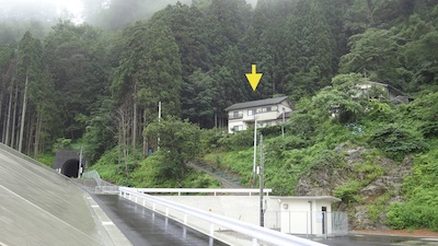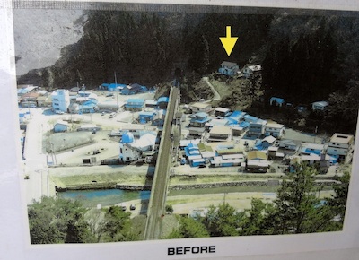 こちらの左の写真は島越駅のホームに掲示してあった震災前の写真です。駅舎と線路、そして多くの民家が写っています。しかし津波により黄色の矢印の家以外はほとんどすべて消失してしまいました。右の写真は現在の様子です。かなり高台にあったために津波の災害を免れた民家です。