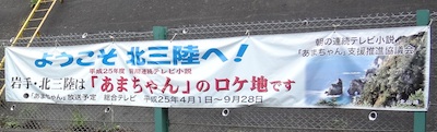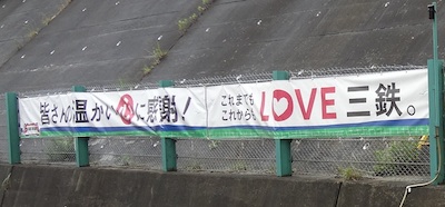 山側の斜面には「皆さんの温かい心に感謝!」「これまでもこれからもLOVE三鉄。」「ようこそ北三陸へ!」などの垂れ幕がありました。あまちゃん効果が抜群のようですね。