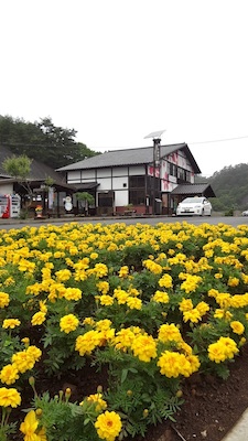 駅前の歩道にある花壇と田野畑駅舎です。