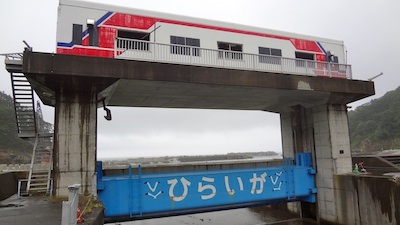 田野畑駅から下って海の近くまで行ってみました。徒歩で5分ほどです。平井賀川水門には三陸鉄道の列車のオブジェがあります。決して津波でこのようになったわけではありません。