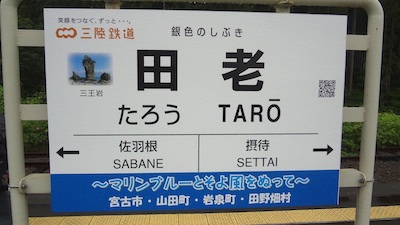 田老駅の駅名標です。愛称は“銀色のしぶき”です。