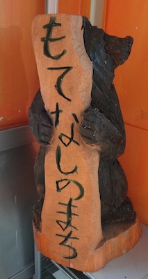 ホームの待合室の中には「もてなしのまち」と書いた看板を持った木彫りの熊がいました。