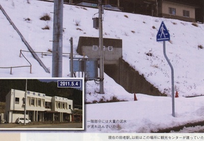 左の写真は「旅と鉄道」2014年5月号から震災後の田老駅の様子です。田老駅入口の前には観光センターがありましたが、現在では撤去されています。右の写真はWikipediaからの引用で、震災前です。