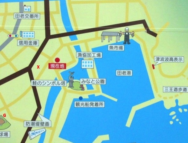 観光案内図(Wikipediaから引用)です。茶色で示してあるのが防潮堤です。1966年(昭和41年)に高さ10m、総延長2,433mの巨大な防潮堤が築かれ、津波対策は万全のはずでしたが・・・・・   ご存知のように巨大津波は巨大防潮堤を軽々と乗り越えたのです。