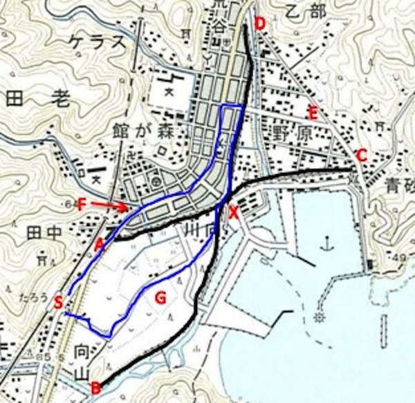 こちらは地形図(国土地理院ホームページから引用)です。黒い部分が防潮堤です。青い線は私が歩いたコースです。
